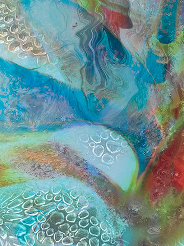 AZURE & AQUA, S Lykins’ digital painting, uses multiple layers of color & texture for a beautiful & entertaining addition to a well lit room.