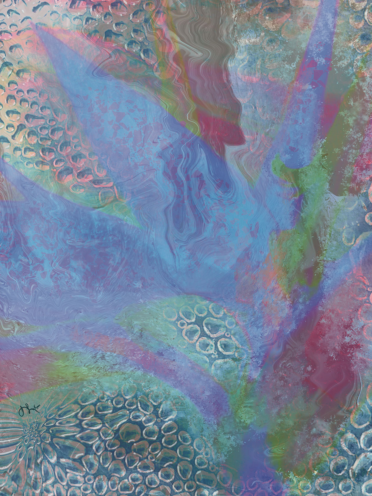 Blue Bird of Paradise, S Lykins’ digital abstract painting, high light reveals layers of blues, purples, & mauves, a beautifully vibrant wall decor.