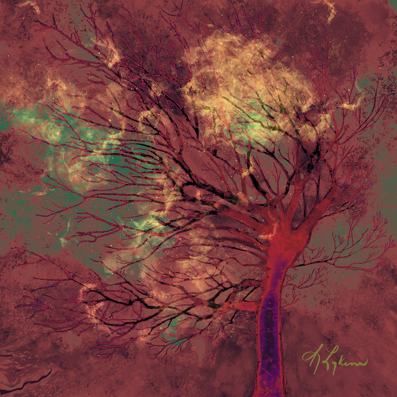 WEST TEXAS SKY SHOW, S Lykins’ abstract digital painting uses beautiful swirls of color & the tree from W. Tx Winds Moderate lighting